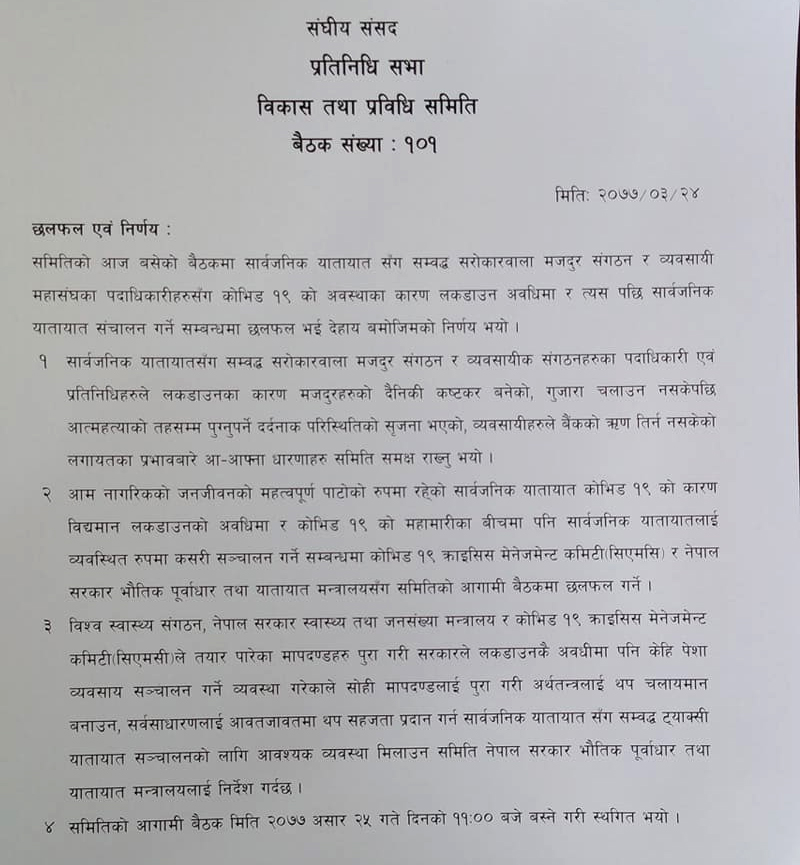 लकडाउनका कारण चैत ११ गतेबाट सार्वजनिक यातायात बन्द छन्। समितिमा भएको छलफलमा सार्वजनिक यातायातसँग सम्बद्ध सरोकारवालाहरूले लकडाउनका कारण मजदुरहरूको दैनिकी कष्टकर बनेको, गुजारा चलाउन नसकेपछि आत्महत्या गर्ने अवस्थासमेत सिर्जना भएको गुनासो गरेका थिए।