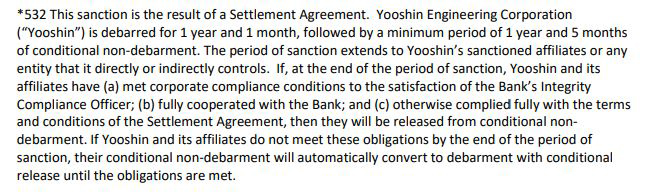 विश्व बैंकले २६ असारमा (१० जुलाई) मा निर्णय गरेर कोरियन कम्पनी योसिन इन्जिनियरिङ कर्पोरेसनको जेभीलाई १३ महीनाका लागि प्रतिबन्ध लगाएको हो। उक्त कोरियन कम्पनी भारतमा पनि प्रतिबन्धमा परेको छ। उक्त कम्पनीले भानुआतुमा एभिएशन इन्भेष्टमेन्ट प्राेजेक्टमा गैरकानूनी काम गरेपछि विश्व बैंकले योसिन इन्जिनियरिङ कर्पोरेसनलाई प्रतिबन्ध लगाएकाे हाे।