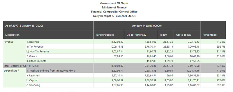 सरकारले संशोधित राजस्वको लक्ष्यअनुसार भने राजस्व संकलन गर्न सफल भएको छ। महालेखा नियन्त्रकको कार्यालयले उपलब्ध गराएको तथ्यांकअनुसार गत आर्थिक वर्षमा सरकारले कर र गैरकर गरी सात खर्ब ९३ अर्ब ७८ करोड राजस्व संकलन गरेको छ।