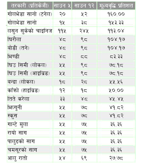 यसैगरी, यही अवधिमा गान्टे मुला, रायो, पालुङ तथा चमसूरका सागमा ३६.३६ प्रतिशत र आलु रातोमा २७.७८ प्रतिशतले मूल्यवृद्धि भएको तुलनात्मक मूल्यसूचीमा पाइएको छ। यीबाहेक अन्य तरकारीको मूल्यसमेत बढेका छन्।