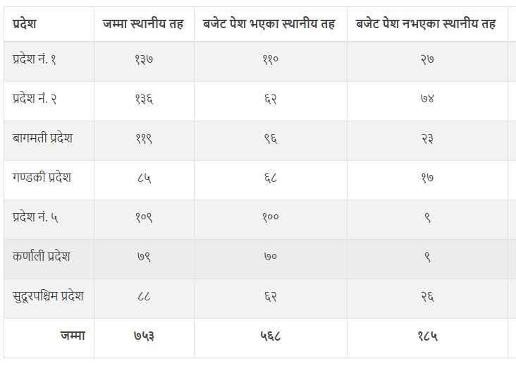 प्रदेश १ का १३७ स्थानीय तहमध्ये हालसम्म ११० वटाले बजेट पेश गरेका छन् भने २७ वटाले गरेका छैनन्। बागमती प्रदेशमा रहेका ११९ स्थानीय तहमध्ये ९६ वटाले बजेट पेश गरेका छन्। २३ वटा स्थानीय तहले अझैसम्म बजेट पेश गर्न सकेका छैनन्।