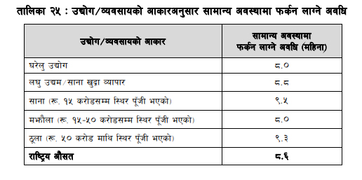 औद्योगिक वर्गीकरणअनुसार सामान्य अवस्थामा फर्कन लाग्ने समय । स्राेत: नेपाल राष्ट्र बैंक