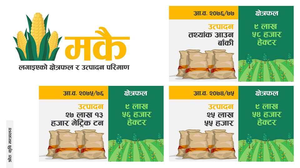 " /> काठमाडौं। नेपालमा धानपछि सबभन्दा बढी उत्पादन हुने खाद्यान्न बालीका रूपमा मकैलाई लिइन्छ।यो तराईका जिल्लादेखि उच्च हिमाली भेगसम्म उत्पादन हुन्छ। तर, नेपालको मागलाई भने यसले धान्न सकेको छैन।