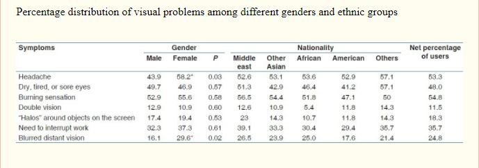 एनल्स अफ मेडिकल हेल्थ साइन्स रिर्सचको जर्नलमा प्रकाशित अध्ययनले पनि यसवारे धेरै कुराहरू प्रष्ट पारेको छ। संयुक्त अरब इमिरेट्सका दुई विश्व विद्यालयका ५०० विद्यार्थीहरूमा आँखामा कम्युटरको असरबारे भएको अध्ययनले डिजिटल डिभाइसका कारण ५४.३ प्रतिशतमा बर्निङ सेन्सेन ५३.३ प्रतिशतमा टाउको दुख्ने ५३.३ जस्ता समस्या रहेको देखाएको थियो।