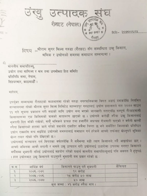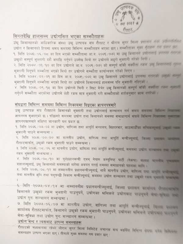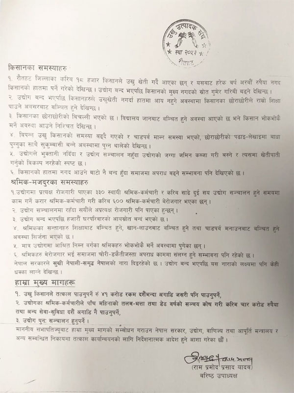 उखु उत्पादक संघले भुक्तानी दिलाइदिन र बन्द भएको उखु मिल पुनः सञ्चालनमा आउने वातावरण मिलाइदिन अनुरोध गरेको छ।
