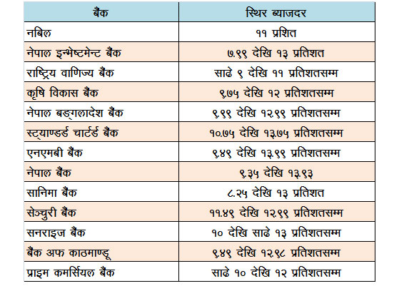 " /> काठमाडौं। नेपाल राष्ट्र बैंकले एक महीनाअघि दिएको निर्देशनअनुसार बैंक तथा वित्तीय संस्थाहरूले ब्यक्तिगत आवधिक ऋणको स्थिर ब्याजदर सार्वजनिक गरेका छन्।एक वर्षमाथिको ब्यक्तिगत आवधिक ऋणमा यस्तो ब्याजदर लागू हुनेछ। राष्ट्र बैंकले कात्तिक १ गतेबाट स्थिर ब्याजदर लागू गर्न निर्देशन दिएको थियो। यस्तो ब्याजदर विशेषगरी घर र गाडी खरिदको ऋणमा लागू हुनेछ।
