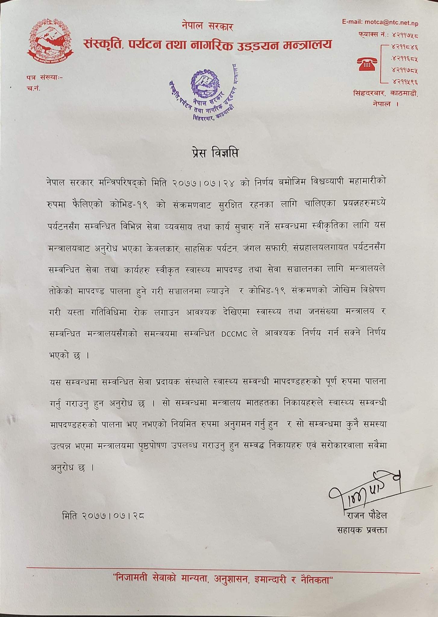 मन्त्रालयले केबलकार, जंगल सफारी र संग्रहालयजस्ता क्षेत्र खोल्न मन्त्रिपरिषद्ले स्वीकृत दिएपछि स्वास्थ्य तथा जनसङ्ख्या मन्त्रालयले तोकेका कोरोनाबाट सुरक्षित रहने उपाय अपनाएर खुला गर्न अनुरोध गरेको हो।