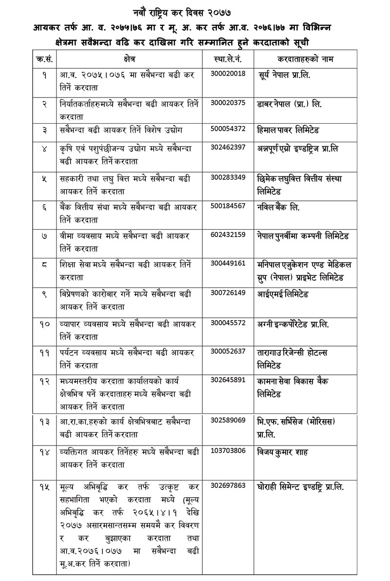 विभागले आयकरतर्फ आर्थिक वर्ष २०७५/७६ मा र मूल्य अभिवृद्धि करतर्फ आर्थिक वर्ष २०७६/७७ मा विभिन्न क्षेत्रमा सबैभन्दा बढी कर दाखिला गर्ने कम्पनीहरूलाई सम्मानित गरेको हो।