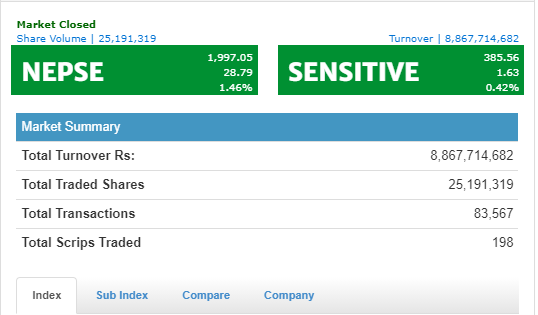 आज नेप्से २८.७९ अंकले बढेर परिसूचक १,९९७ अंकमा पुगेर रोकिएको छ। यस क्रममा ८ अर्ब ८६ करोड रुपैयाँको कारोबार भई २ करोड ५१ लाख कित्ता सेयर किनबेच भएको छ।