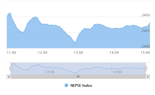 <p style="text-align: justify;">काठमाडौं। आज सोमबार नेपाल स्टक एक्सचेञ्ज (नेप्से) १६ अंकले बढेको छ। साताको दोस्रो कारोबार दिन आज परिसूचक दुई हजार चार सय ४० अंकमा पुगेर रोकिएको हो।</p>