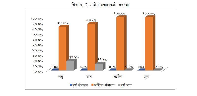प्रतिवेदनले अध्ययनमा सहभागी उद्योगमध्ये १०.८१ प्रतिशत उद्योग पूर्ण रूपमा बन्द भएको र ८९.१९ प्रतिशत उद्योग आंशिक क्षमतामा चलेको समेत देखाएको छ।