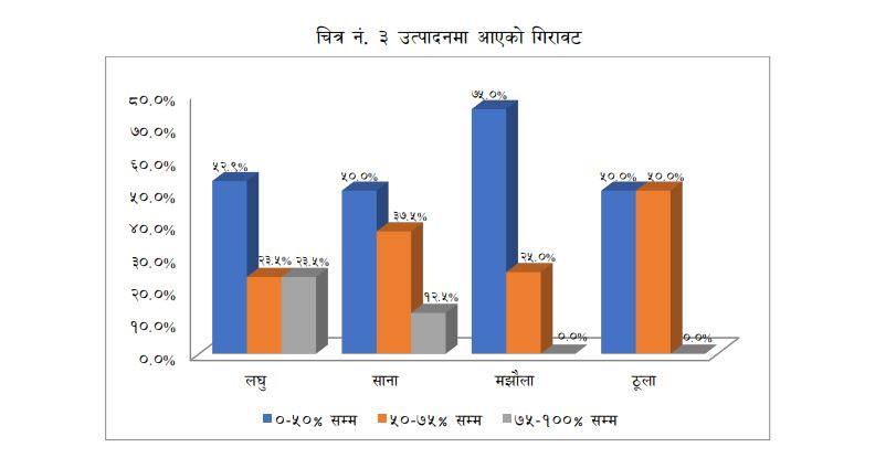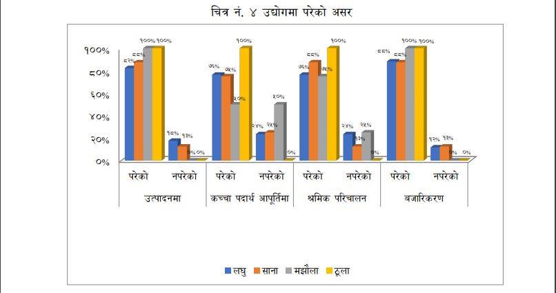 यसै गरी, ८२.३५ प्रतिशत साना तथा घरेलु उद्योगलाई उत्पादनमा समस्या पर्नुका साथै ७६.४७ प्रतिशत उद्योगलाई कच्चा पदार्थ जुटाउनै समस्या परेको प्रतिवेदनले देखाएको छ।