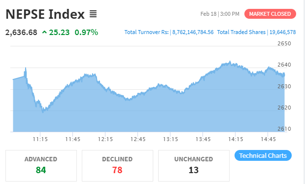 नेप्सेमा २५ अंकको वृद्धिसँगै नेप्से परिसूचक दुई हजार छ सय ३६ अंकमा पुगेर रोकिएको छ। यस क्रममा एक करोड ९४ लाख कित्ता सेयर किनबेच भएर आठ अर्ब ६७ करोड रूपैयाँको कारोबार भएको छ।