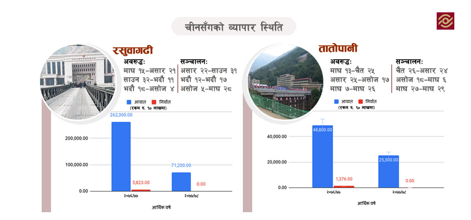 नेपालको आयात तथा निर्यातको तथ्यांक राख्ने नियका विभागले सार्वजनिक गरेको सात महिनाको तथ्यांकअनुसार रसुवागढी र तातोपानी नाकाबाट निर्यात नै नभएको हो।