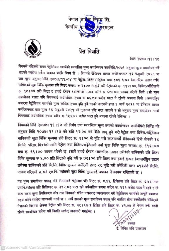 <p style="text-align: justify;">काठमाडौँ। नेपाल आयल निगमले आज राति १२ बजेदेखि लागु हुने गरी पेट्रोलियम पदार्थको मूल्य बढाएको छ।</p>