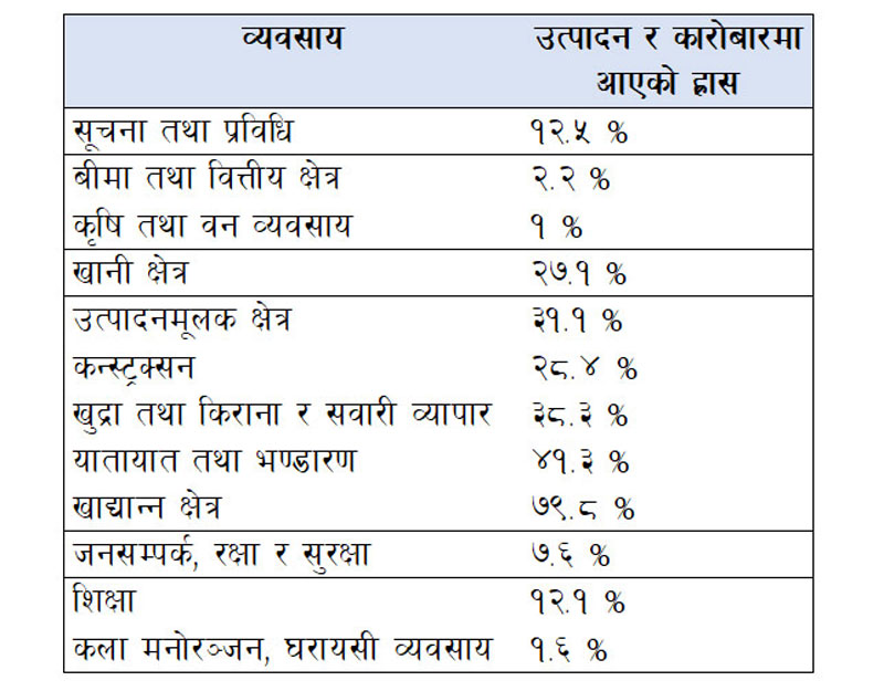 अधिकांश व्यावसायिक क्षेत्र आर्थिक संकटमा परेर कारोबार र उत्पादन नै ऋणात्मक बन्दा १८ मध्ये ६ क्षेत्रको उत्पादन र कारोबारमा सुधार देखिएको छ।