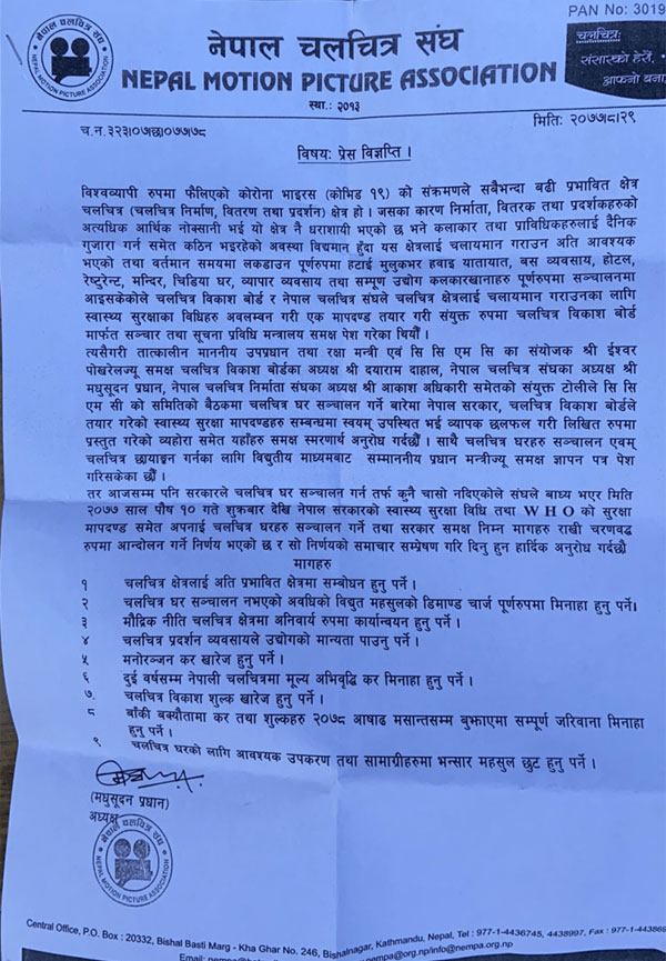 संघले आज पत्रकार सम्मेलन गर्दै सरकारलाई दबाब दिन निर्णय गरिएको जानकारी दिएको छ। महामारीका कारण सबैभन्दा बढी चलचित्र क्षेत्र प्रभावित भएको भन्दै संघले सरकारलाई दबाब दिन हल खोल्ने निर्णय गरिएको संघका अध्यक्ष मधुसूदन प्रधानले बताए।
