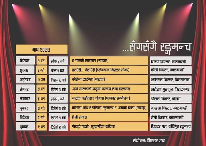 थिएटर हबले नाटकघर खुलेसँगै आयोजना हुने कार्यक्रम पनि सार्वजनिक गरेको छ।