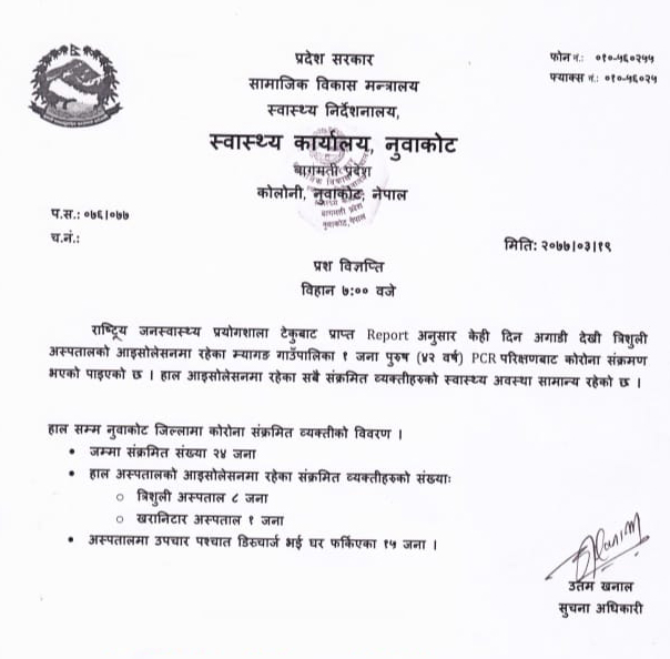 <p style="text-align: justify;">गण्डकी प्रदेशको सामाजिक विकास मन्त्रालयअन्तर्गतको स्वास्थ्य कार्यालय नुवाकोटले आज बिहान विज्ञप्तिमार्फत ४२ वर्षीय एक पुरूषमा संक्रमण पुष्टि भएको जानकारी दिएको छ।</p>