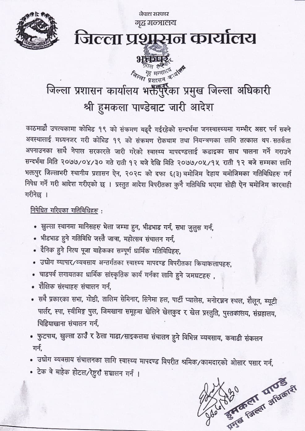 निषेधाज्ञा भदौ १५ गते राति १२ बजेसम्मका लागि घोषणा गरिएको छ।