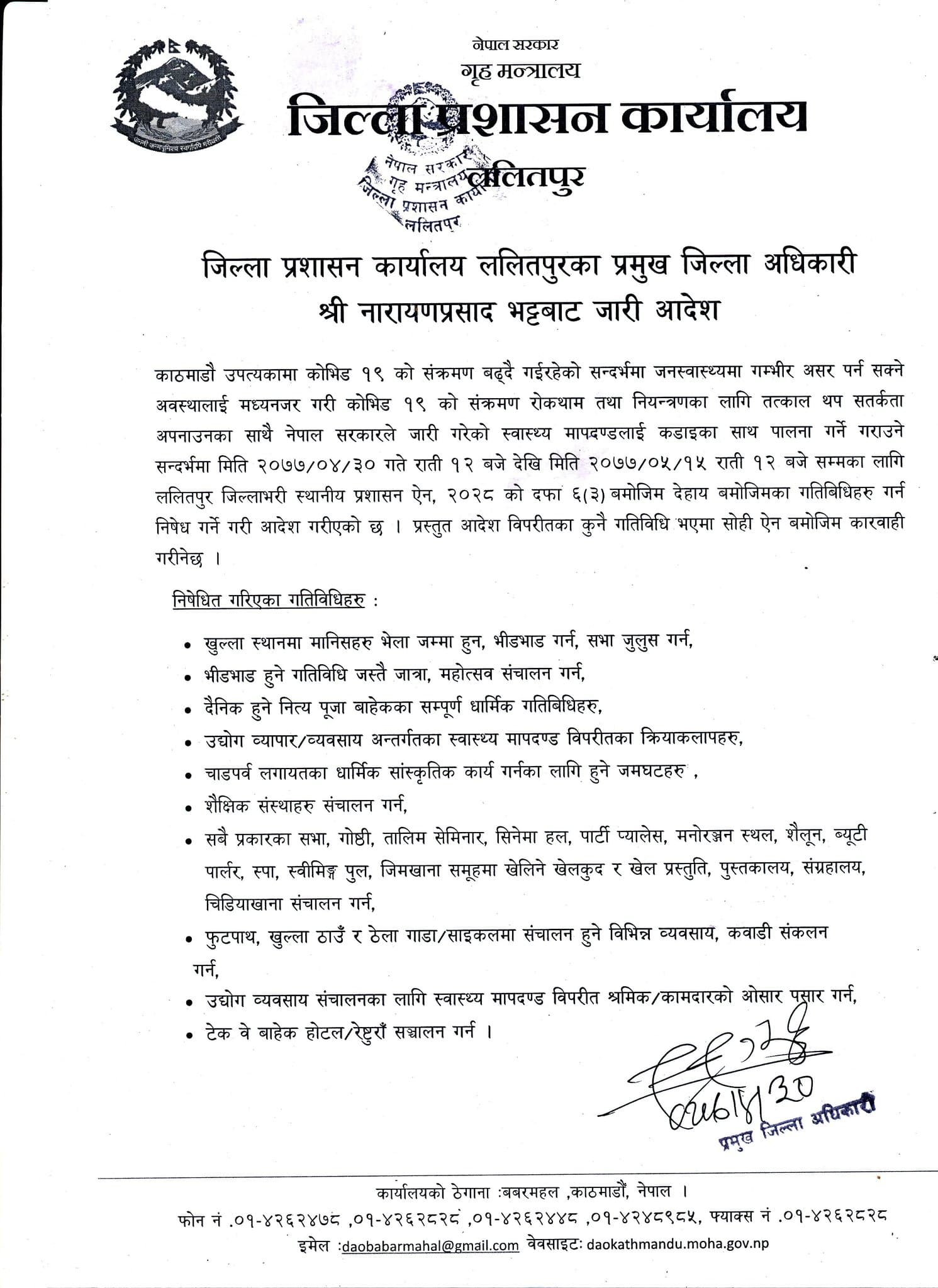 निषेधाज्ञामा बन्देज गरिएका गतिविधि गरेमा कारबाही गरिने प्रशासनले चेतावनीसमेत दिएकाे छ।