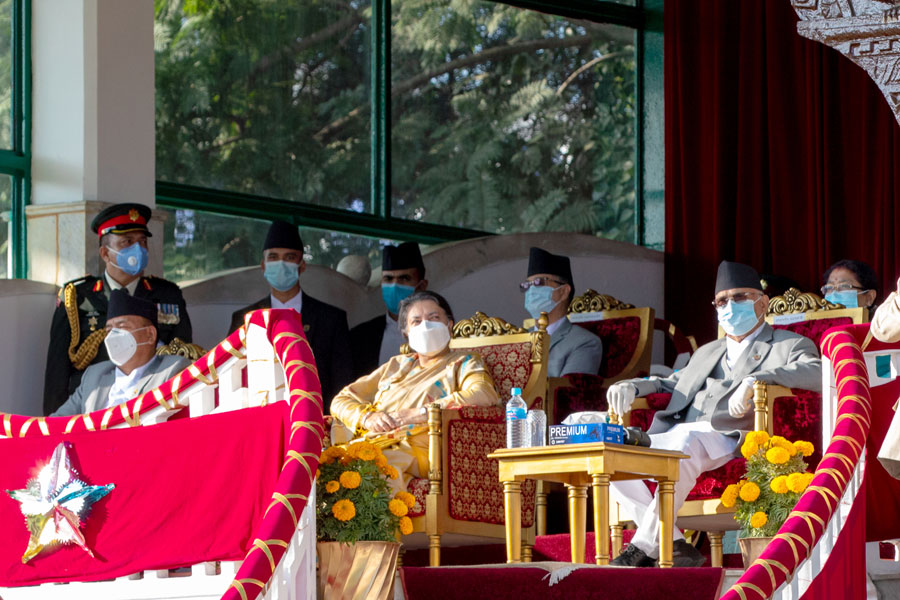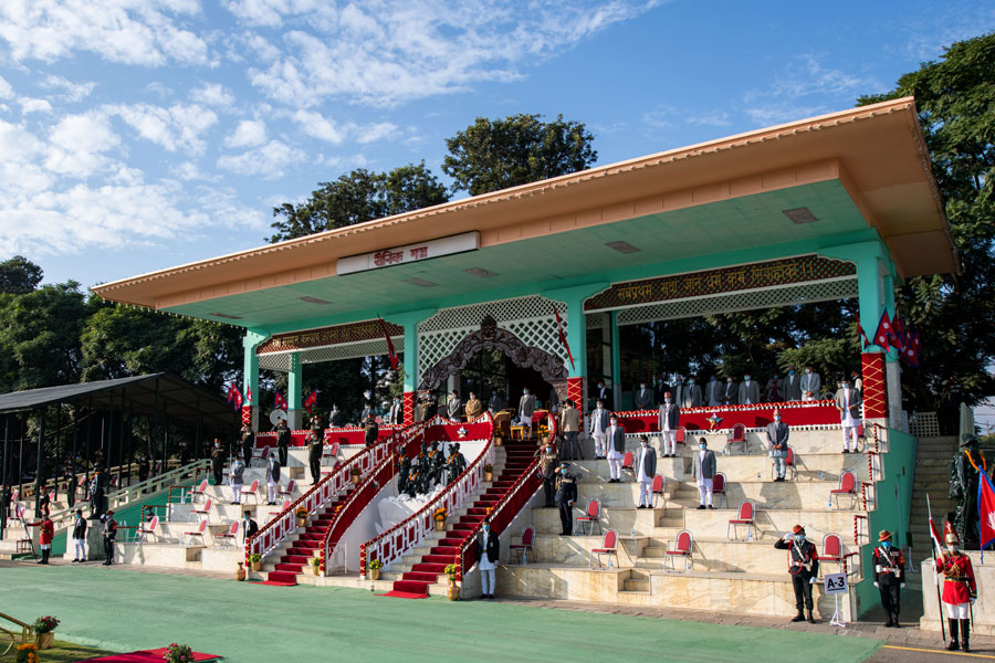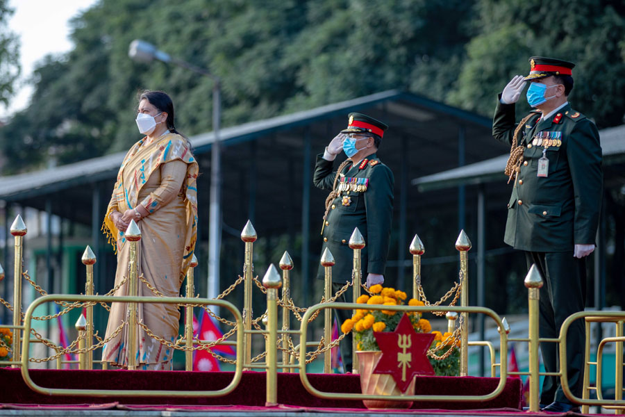 " /> काठमाडाैं। नेपाली सेनाले यस वर्षकाे फूलपाती बढाइँ सांकेतिकरूपमा मात्र आयोजना गरेकाे छ। कोभिड-१९ को संक्रमणका कारण यस वर्षको फूलपाती बढाइँ धर्म, संस्कृति र परम्परालाई निरन्तरता दिने उद्देश्यले सांकेतिकरूपमा मात्र आयोजना गरिएकाे हाे।नेपाली सेनाद्वारा आज अपराह्न सैनिक मञ्च टुँडिखेलमा आयोजित फूलपाती बढाइँ समारोहमा राष्ट्रपति विद्यादेवी भण्डारी सहभागी भएकी छन्।