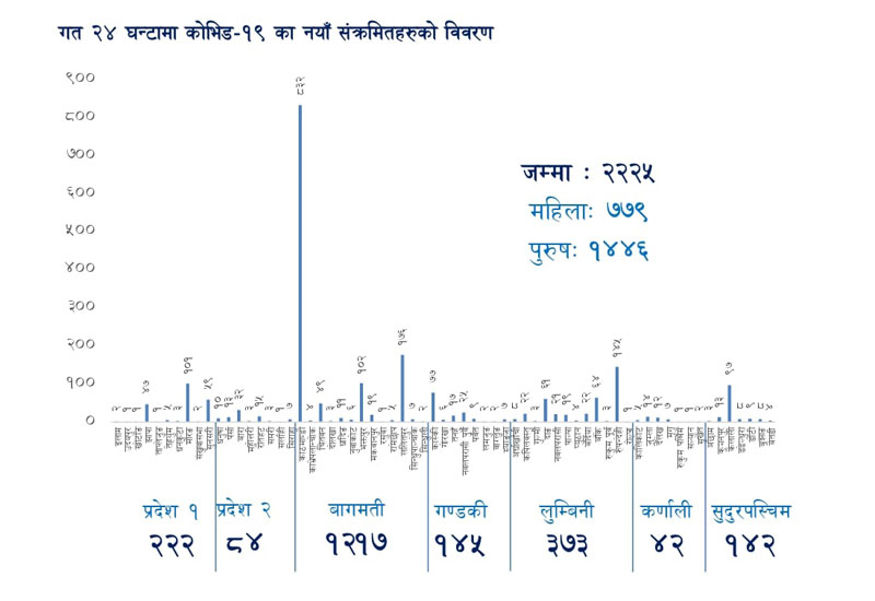 उक्त अवधिमा नेपालभर दुई हजार २२५ जना संक्रमित थपिएका छन्। ती संक्रमितमध्ये सबैभन्दा धेरै बागमती प्रदेशका एक हजार २१७ जना रहेका छन्।