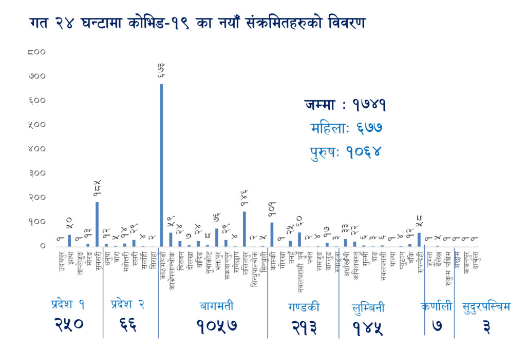 उक्त अवधिमा नेपालभर एक हजार ७४१ जना संक्रमित थपिएका छन्। ती संक्रमितमध्ये सबैभन्दा धेरै बागमती प्रदेशका एक हजार ५७ जना रहेका छन्।