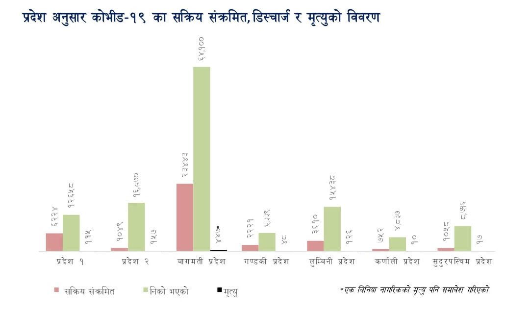स्वास्थ्य तथा जनसंख्या मन्त्रालयले सार्वजनिक गरेको तथ्यांकअनुसार सबैभन्दा धेरै संक्रमित बागमती प्रदेशमा रहेका छन्। बागमती प्रदेशमा २३ हजार ४४३ सक्रिय संक्रिमित रहेका छन्, जुन देशभर रहेका कूल सक्रिय संक्रमित संख्याको आधाभन्दा बढी हो।