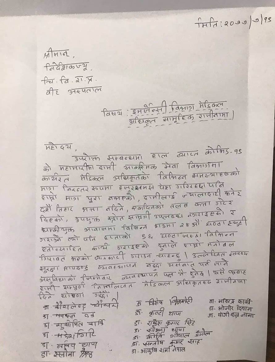 आकस्मिक सेवा विभागमा कार्यरत मेडिकल अधिकृतहरूले विभिन्न समस्याको समाधानका माग गर्दै अस्पताल प्रशासनलाई ज्ञापनपत्र बुझाएका थिए। आफूहरूले अघि सारेका माग सम्बोधन गर्नुको साटो बेवास्ता गरेको भन्दै उनीहरूले आजदेखि लागू हुने गरी राजीनामा दिएका हुन्।