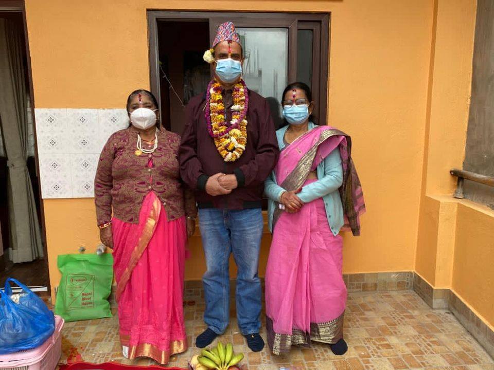 भर्खरै कोरोना संक्रमणमुक्त भएका वरिष्ठ हास्य कलाकार हरिवंश आचार्यले आफ्नो दिदीबहिनीको हातबाट टीका लगाएका छन्। दुई दिदीबहिनीको हातबाट टीका थापेका हरिवंशले मुखमा मास्क लगाएका फोटो सामाजिक सञ्जामा सेयर गरेका छन्।