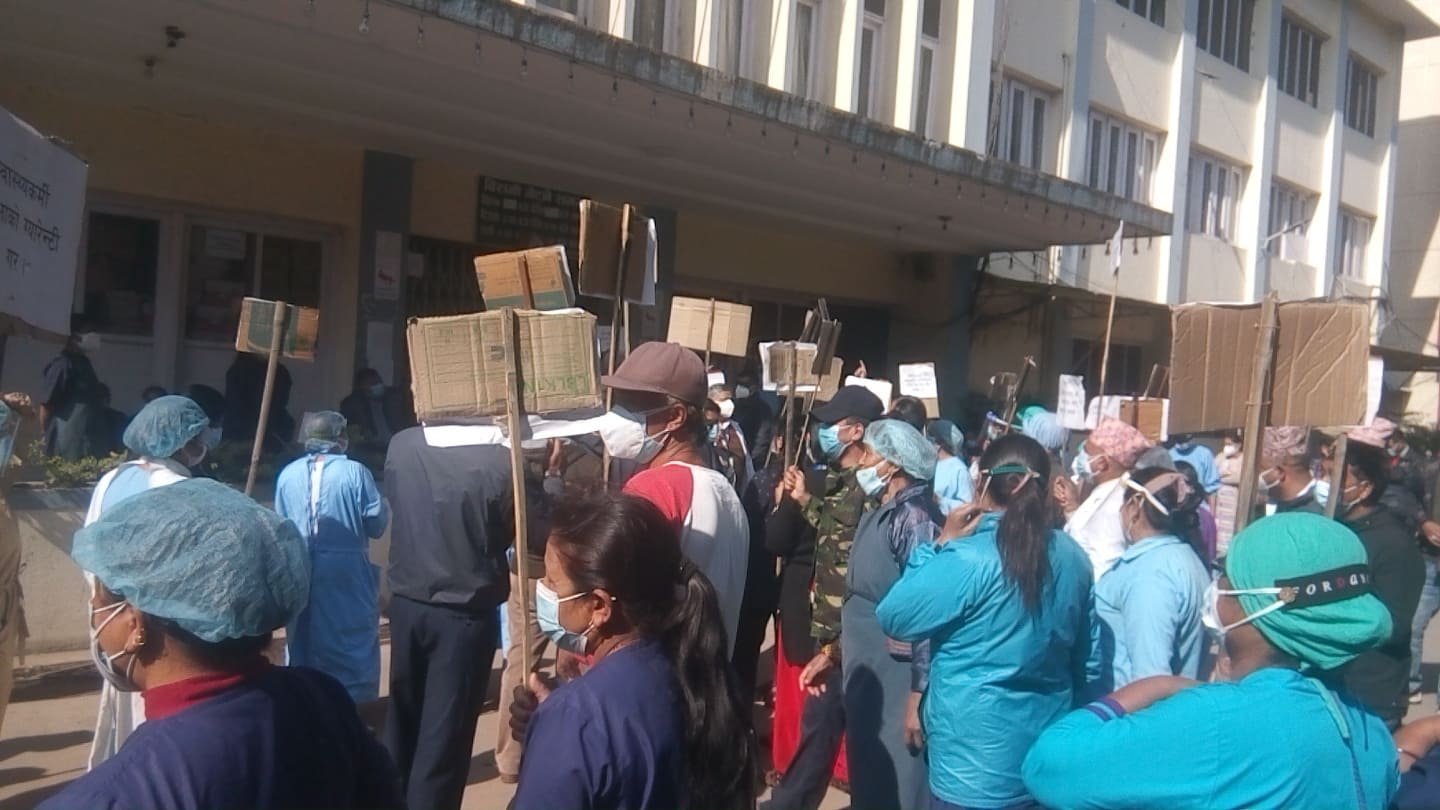 <p>हालसम्मको कोभिड भत्ता, औषधि खरिद खर्च, सेवा विस्तार भत्ता नदिएको, अस्थायी/करार कर्मचारीहरूले समयमा पारिश्रमिक नपाएकाे भन्दै कर्मचारीहरू आन्दोलनमा उत्रिएका हुन्। </p>
