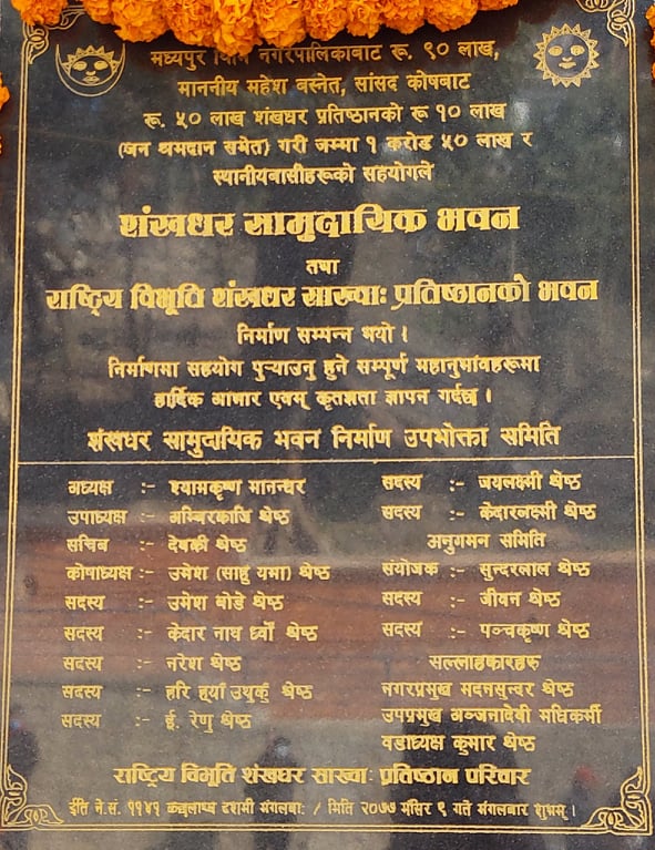 उनले नेपाल सरकारले नेपाल संवत् ११२० कछलाथ्व दशमी अर्थात् वि.सं. २०५६ मंसिर २ गते साख्वाःलाई राष्ट्रिय विभूति घोषित गरेको स्मरण गराउँदै उनको सम्मानमा सामुदायिक र प्रतिष्ठानको भवन निर्माण गरी हस्तान्तरण गर्न पाउँदा खुशी लागेको बताएका छन्। श्रेष्ठले नगरपालिकाको ९० लाख, सांसद महेश बस्नेतको सांसद कोषबाट ५० लाख र शंखधर प्रतिष्ठानको तर्फबाट जनश्रमदानसहित १० लाख गरी एक करोड ५० लाखमा सो भवन उपभोक्ता समितिमार्फत् निर्माण भएको हो। उनले भवनमा सूचना केन्द्र, संग्राहलय र हल रहने पनि बताएका छन्।