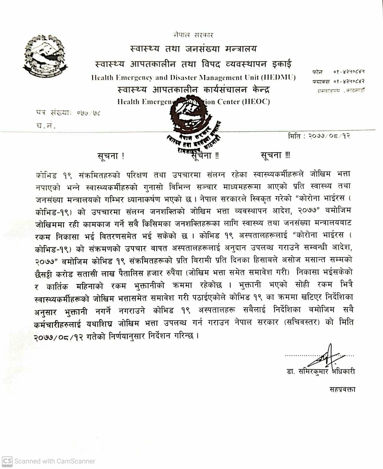 उनले निर्देशन दिँदै भनेका छन्, “निकासा भएको सोही रकमभित्रै स्वास्थ्यकर्मीको जोखिम भत्तासमेत समावेश गरी पठाइएकाले कोभिड-१९ का क्रममा खटिएर निर्देशिकाअनुसार भुक्तानी नगर्ने नगराउने सबै कोभिड अस्पताललाई निर्देशिका बमोजिम यथाशीघ्र जोखिम भत्ता उपलब्ध गराउन निर्देशन गरिन्छ।”