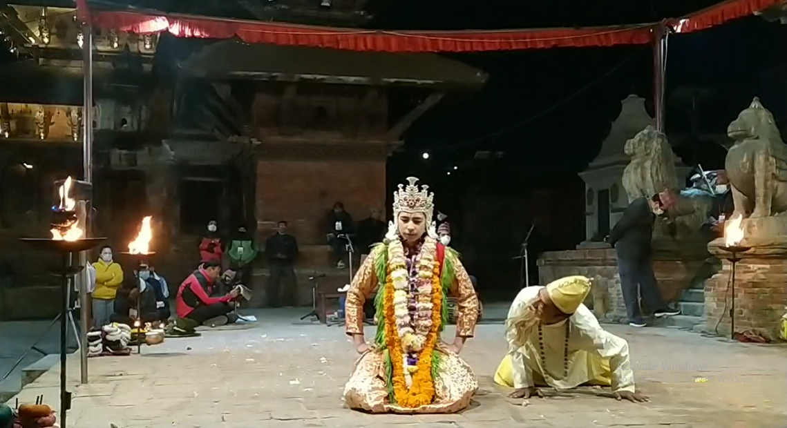 " /> काठमाडौँ। ललितपुरको प्रसिद्ध कार्तिक नाचअन्तर्गत शनिबार मध्यरातमा नरसिंह अवतारको नाच प्रस्तुति हुँदै छ।सो नाचको क्रममा एउटा दृश्य आउँछ, प्रह्लादलाई ‘ॐ नमः शिवाय’ सिकाउन दुई ऋषिहरू प्रयास गर्छन्। भगवान् विष्णुका भक्त र दैत्यराज हिरण्यकश्यपुका पुत्र प्रह्लादलाई यसरी शिवमन्त्र सिकाउन खोज्दा प्रह्लादले भने ‘ॐ नमो भगवते वासुदेवाय’ मात्र भन्ने यस दृश्यमा प्रदर्शन गरिन्छ।