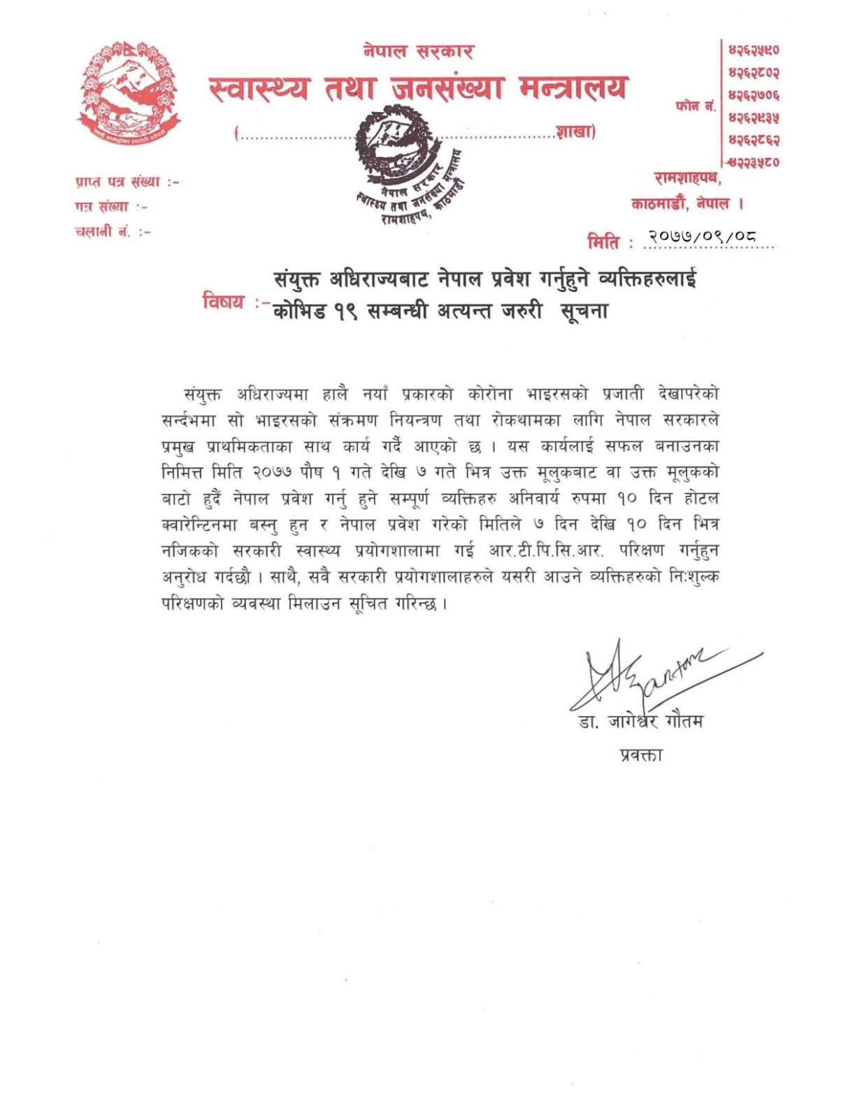 बेलायतमा देखिएको नयाँ स्वरूपको कोरोना भाइरस नेपालमा नआओस् भनेर मंगलबारदेखि लागू हुने गरी बेलायतबाट आउनेहरूलाई नेपाल प्रवेशमा रोक लगाइएको उनको भनाइ छ।