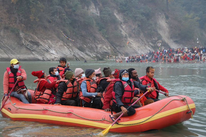 " /> दमाैली। माघे सङ्क्रान्ति पर्वको अवसरमा तीन लाखभन्दा बढी भक्तजनले पवित्र धार्मिक तीर्थस्थल देवघाटस्थित त्रिशूली र कालीगण्डकीको सङ्गम वेणीमा स्नान गरेका छन्। स्नान गर्नका लागि भक्तजन बुधबारदेखि नै देवघाटधाम पुगेका थिए।देवघाट क्षेत्र विकास समितिका कार्यकारी निर्देशक धीरेनबाबु घिमिरेले यस वर्ष तीन लाखभन्दा बढी भक्तजनले सङ्गममा स्नान गरेको जानकारी दिए। कोभिडको जोखिमका कारण यस वर्ष क्षेत्र विकास समितिले औपचारिक कार्यक्रमको आयोजना गरेको थिएन। यद्यपि भक्तजनहरु स्वतःस्फूर्त देवघाटमा स्नान गर्न आएको कार्यकारी निर्देशक घिमिरेले बताए।