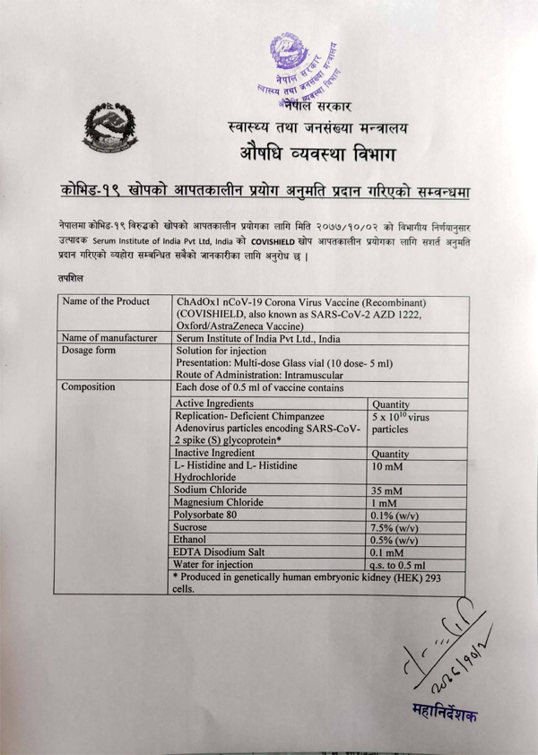 “नेपालमा कोभिड-१९ विरुद्धको खोपको आपतकालीन प्रयोगका लागि २०७७ माघ २ को विभागीय निर्णयानुसार उत्पादक सिरम इन्स्टिच्युट अफ इण्डिया प्रालिको कोभिशिल्ड खोप आपतकालीन प्रयोगका लागि सशर्त अनुमति प्रदान गरिएको व्यहोरा सम्बन्धित सबैको जानकारीको लागि अनुरोध छ,” स्वास्थ्य तथा जनसंख्या मन्त्रालयअन्तर्गतको औषधि व्यवस्था विभागले आज जारी गरेको विज्ञप्तिमा भनिएको छ।