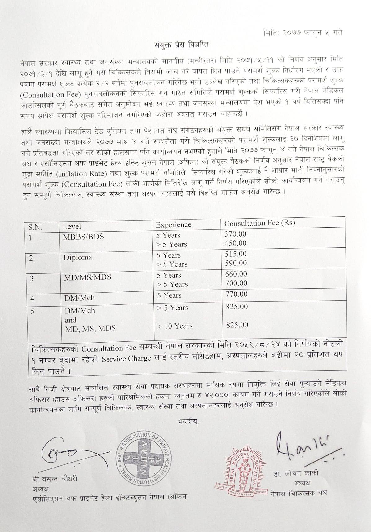 चिकित्सकहरूको परामर्श शुल्क पुनरावलोकनको सिफारिस गर्न गठित समितिले परामर्श शुल्क सिफारिस गरी नेपाल मेडिकल काउन्सिलको पूर्ण बैठकबाट समेत अनुमोदन भइ स्वास्थ्य मन्त्रालयमा पेश गरिएको एक वर्ष भइसकेको थियो। तर, मन्त्रालयले शुल्क परिमार्जन नगरेको भन्दै चिकित्सकहरूका संस्थाले नै शुल्क बढाएका हुन्।