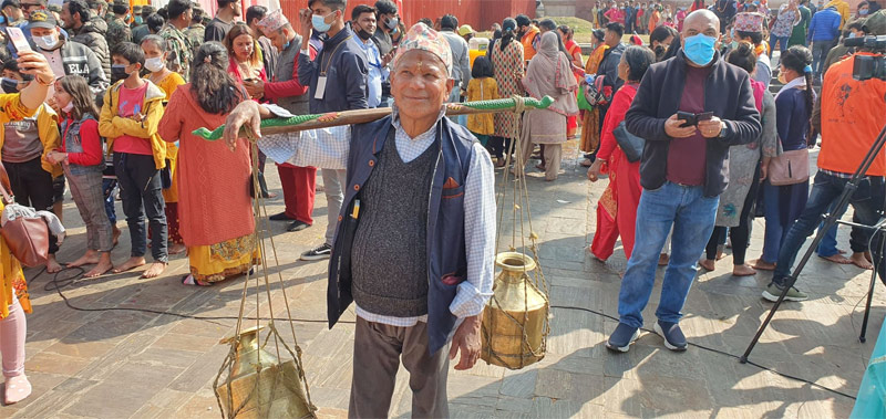 त्यही भीडमा एक जना वृद्ध थिए, जो खर्पनमा पानी बोकेर निःशुल्क रूपमा वितरण गरिरहेका थिए। भक्तपुरका ती वृद्धले दुईवटा गाग्रीमा पानी भरेर खर्पनमा डुलाउँदै भक्तजनहरूलाई दिइरहेका थिए।