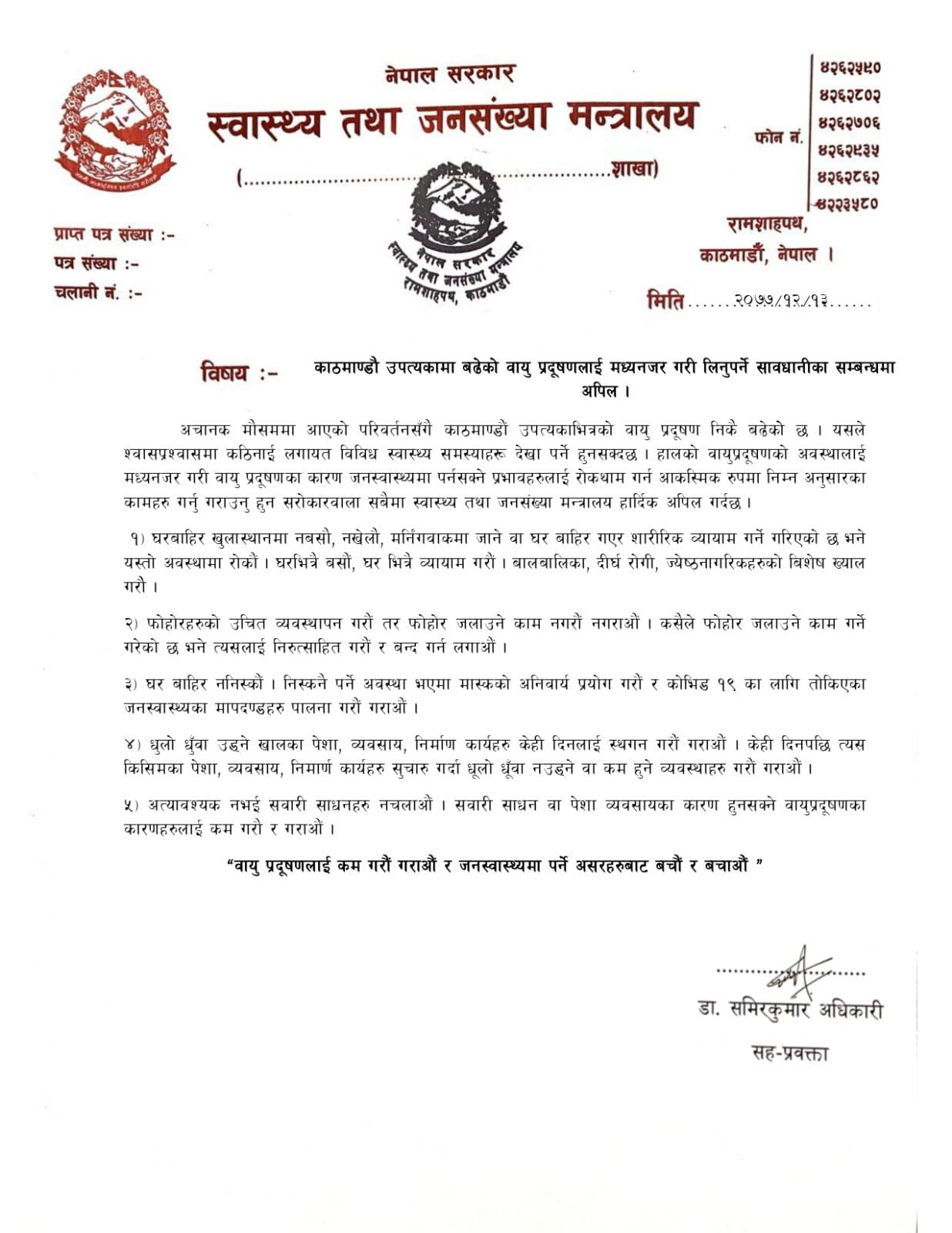 <p style="text-align: justify;">काठमाडौं। बढ्दो वायु प्रदूषणका कारण घर बाहिर ननिस्किन स्वास्थ्य तथा जनसंख्या मन्त्रालयले आग्रह गरेको छ। वायु प्रदूषण निकै बढेको भन्दै घरबाहिर खुला स्थान नबस्न, मर्निङ वाकमा नजान आग्रह गरेको हो। </p>