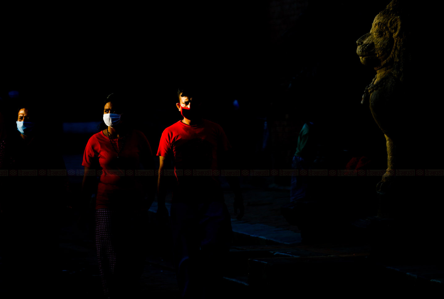 कोभिड–१९ महामारीले मास्कलाई जीवनको अंग बनाइदिएको छ। हिजो धुलोधूवाँबाट मास्क लगाउने गरेता पनि यो अनिवार्य थिएन। अहिले जिन्दगीको निरन्तरताको निम्ति मास्क अनिवार्य बनेको छ। मास्क लगाएर पाटन दरबार क्षेत्रमा हिँडिरहेका केही मानिसहरू।