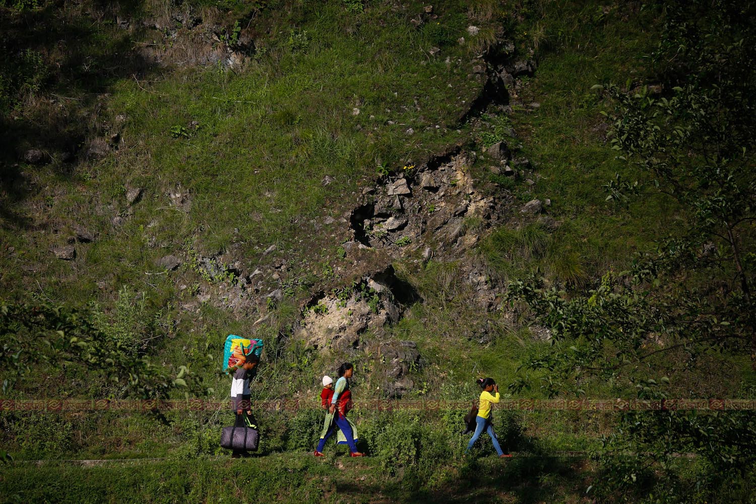 <figcaption class="caption-line">लकडाउनले सवारीसाधन बन्द छन्। तर, गन्तव्य मेटिएको छैन। यात्रा रोकिएको छैन। ललितपुरको झरुवार्सीमा गन्तव्यतिर जाँदै बटुवा।</figcaption>