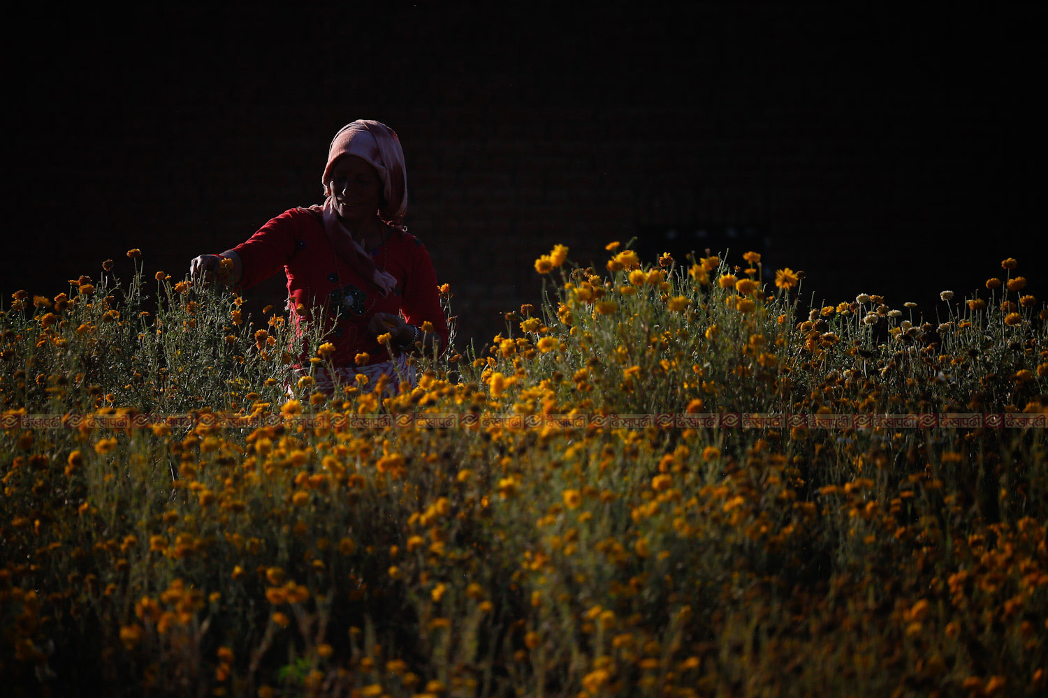 <figcaption class="caption-line">फूलखेती शोख मात्र होइन। यो त जीविकाको निम्ति गरिने व्यवसाय पनि हो। ललितपुर गोदावरी–१, गोदाचौरकी रिता थापा (५०) को लागि फूलखेती व्यवसाय हो। तर, लकडाउनका कारण पुष्प बजार ठप्प भयो। बजारमा नगएका फूल बारीमै खेर जान दिनुभन्दा व्यक्तिगत प्रयोजनका लागि टिप्दैछिन् उनी।</figcaption>
