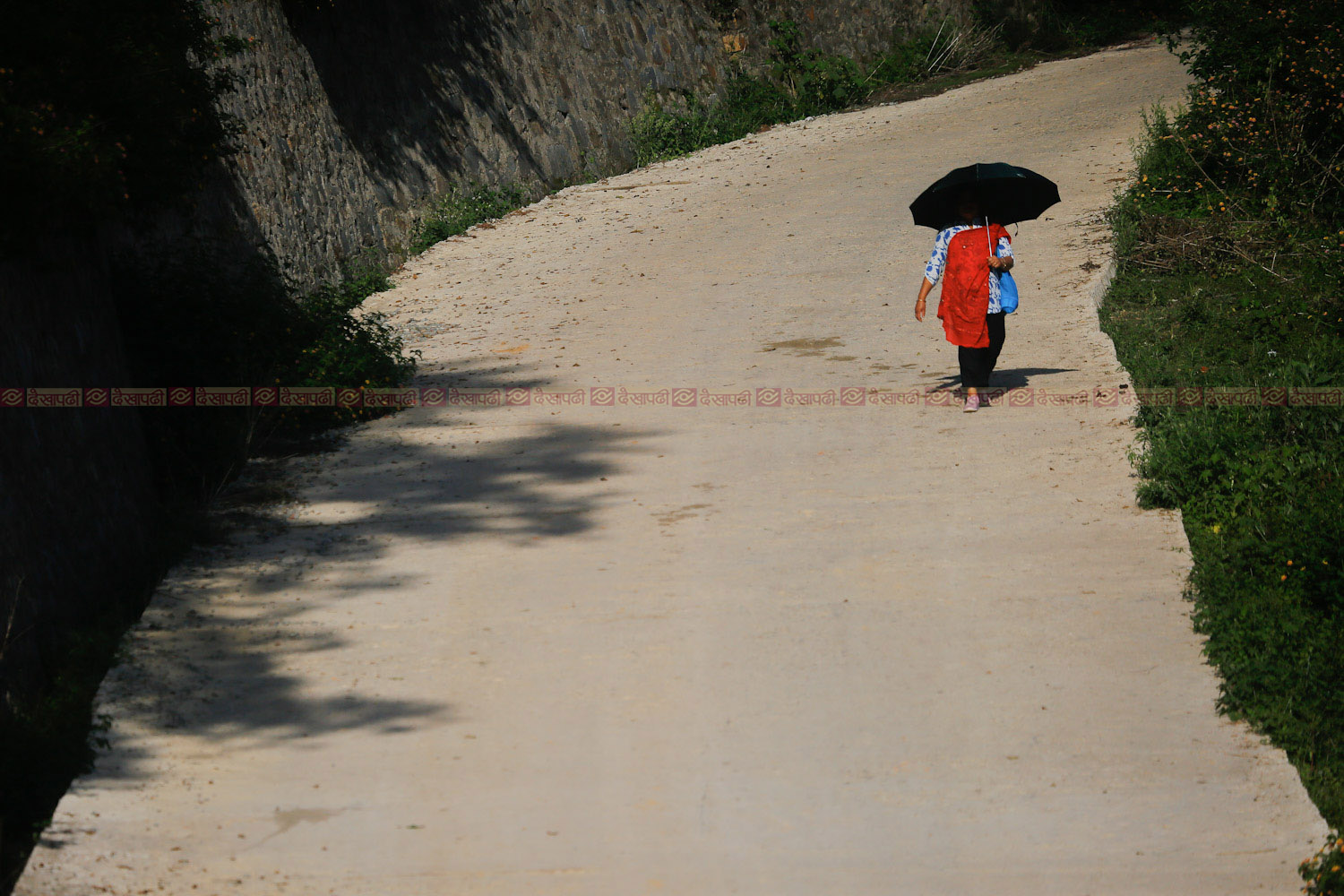 जेठ ढल्किँदै गर्दाको चर्को घाम उपत्यकामा पनि उत्तिकै परेको छ। घाममा छाता ओढेर हिँडिरहेकी ललितपुर झरुवार्सीमा हिँडिरहेकी एक महिला।