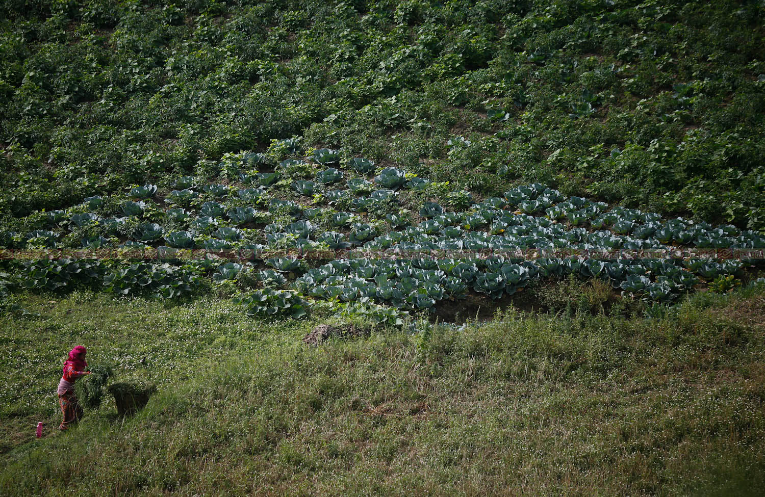 छेउमा तरकारी खेती छ जसको बजार हो काठमाडौं शहर। काठमाडौं उपत्यकाको किनार ललितपुर नागदहमा तरकारी खेतीसँगै पशुपालन पनि गरेका छन् किसानले। तिनै पशुका लागि हरियो घाँस काट्दै एक किसान।