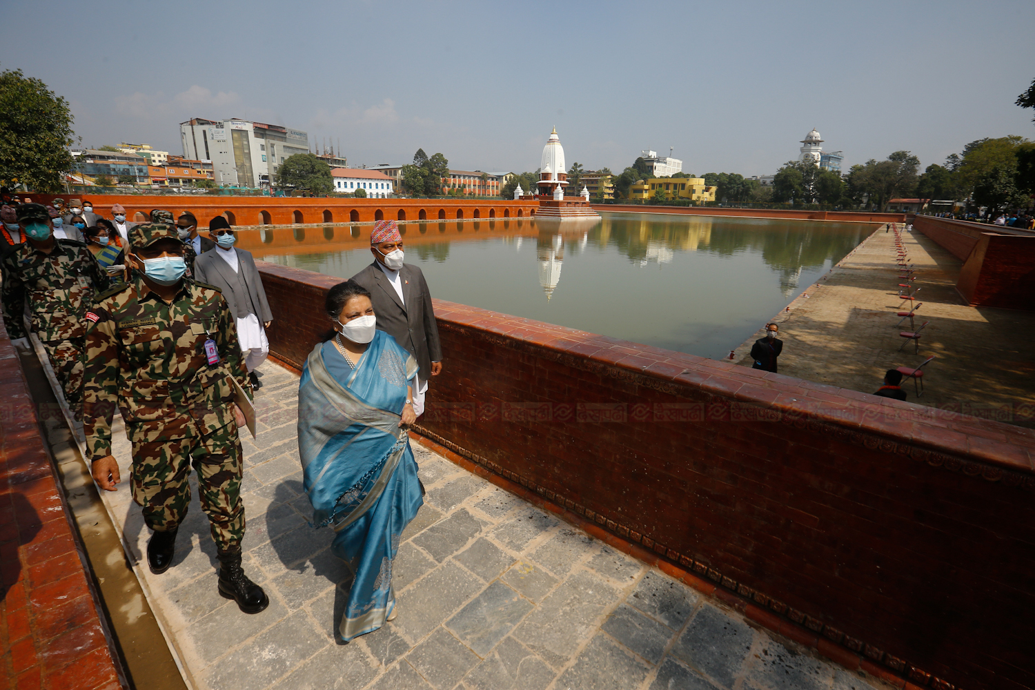 <p>राष्‍ट्रपति भण्डारीले रानीपोखरी परिसरमा राखिएको ताम्रपत्रको अनावरण गरेर पोखरीको उद्घाटन गरिन्। समुद्घाटन समारोहमा प्रधानमन्त्री केपी शर्मा ओलीलगायत अन्य मन्त्री तथा विशिष्‍ट अतिथिहरू उपस्थित थिए। </p>