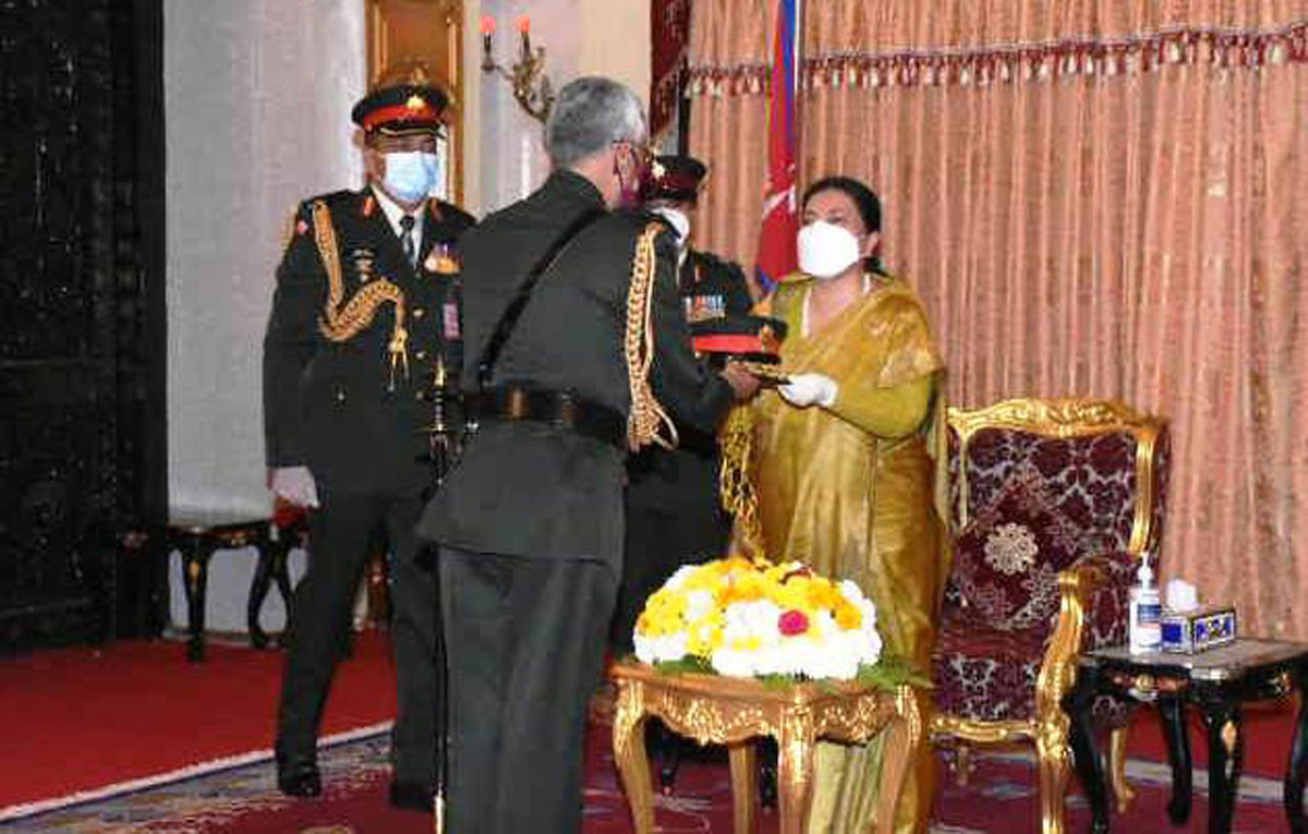 काठमाडाैं। तीन दिने नेपाल भ्रमणमा रहेका भारतीय स्थलसेनाध्यक्ष जनरल मनोजमुकुन्द नरवणेलाई आज राष्ट्रपति विद्यादेवी भण्डारीले नेपाली सेनाको मानार्थ महारथीको दर्जा प्रदान गरेकी छिन्।