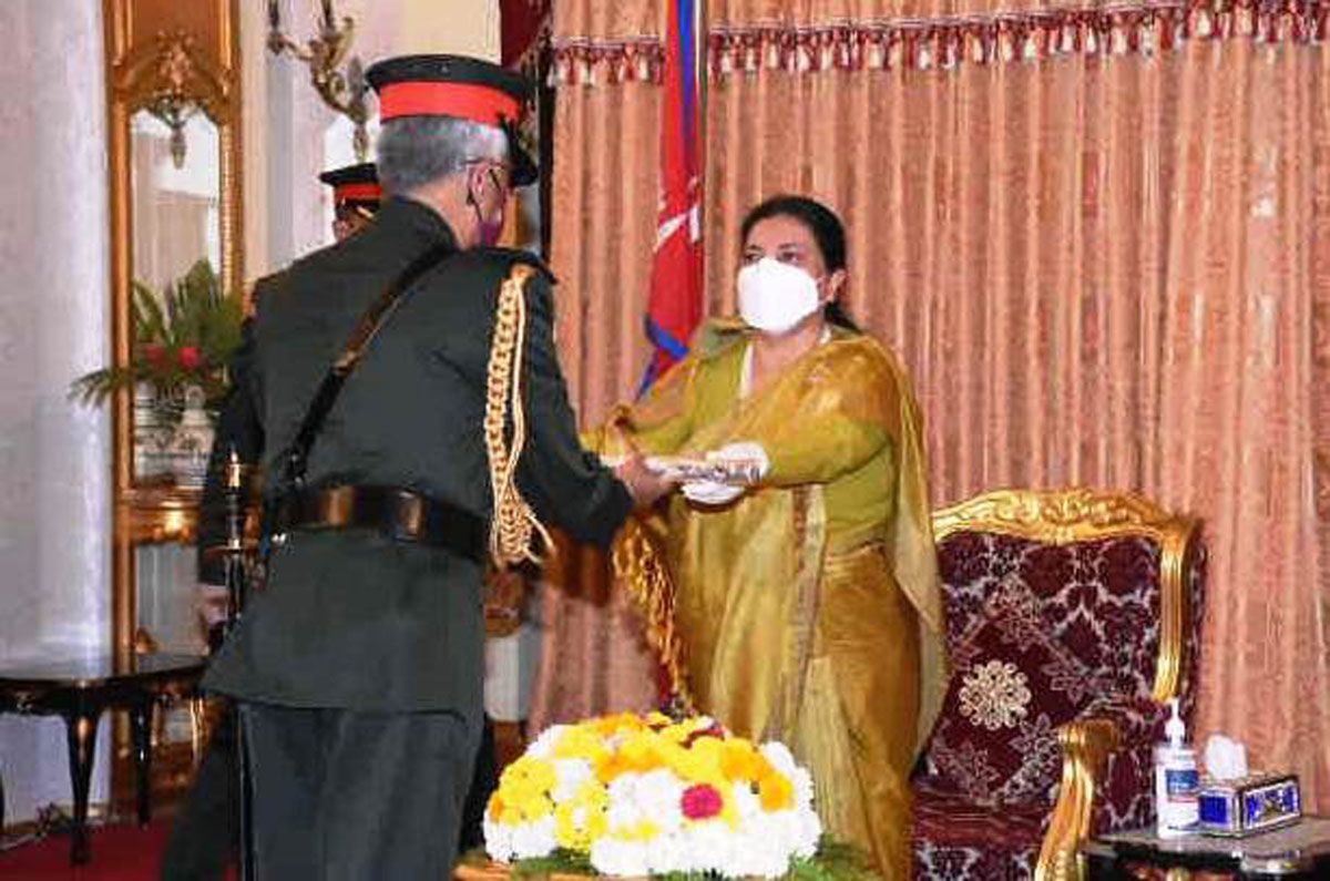 राष्ट्रपति भवन शीतल निवासमा आज अपराह्न आयोजित विशेष समारोहमा राष्ट्रपति भण्डारीले उनलाई नेपाली सेनाको महारथीको दज्र्यानी चिह्न, खड्ग तथा प्रमाणपत्र प्रदान गरिन्। संवैधानिक व्यवस्थानुसार राष्ट्रपति भण्डारी नेपाली सेनाको परमाधिपति छिन्।