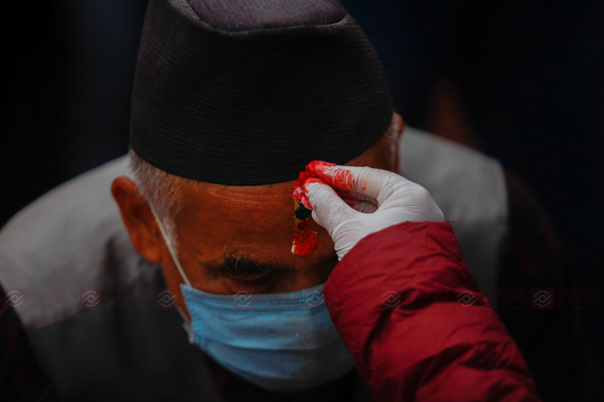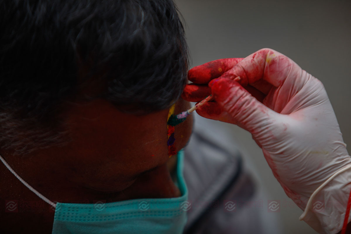 काेराेना भाइरसकाे संक्रमणलाई ध्यानमा राख्दै मन्दिरकाे दर्शन, पूजा र भाइटीका लगाउन सहभागी सबैजनाले मास्क लगाएका देखिन्थे।